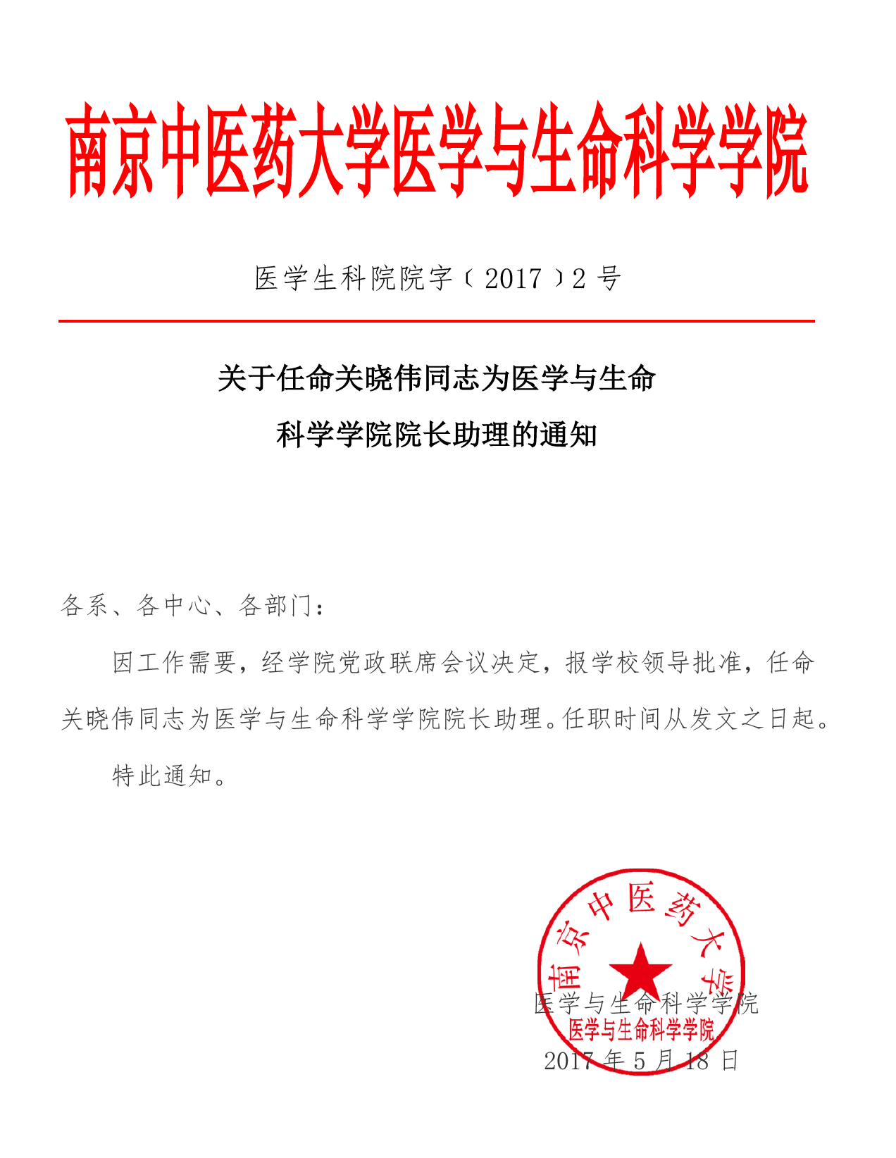关于任命关晓伟同志为医学与生命科学学院院长助理的通知