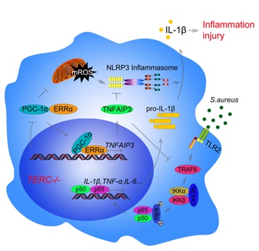 众所周知,年龄影响机体免疫系统的功能和炎症反应状态。与年轻人相比,老年细菌性肺炎的发病率和死亡率均显著增加,其潜在机制有待阐明。端粒是染色体末端的DNA序列,对维持人类基因组的稳定至关重要。细胞每分裂一次,端粒就缩短一次,当端粒不能再缩短时,细胞就无法继续分裂而死亡。因此,端粒被称作“生命时钟”,端粒损伤与衰老相关疾病有关,但端粒功能障碍与感染、免疫和炎症有何关系仍有许多未解之谜。最近,南京中医药大学史丽云教授研究团队在国际期刊Cell Reports刊发了关于“端粒功能失调干扰巨噬细胞线粒体代谢和NLRP3炎症小体活化”的研究论文。        该项研究中,研究者利用端粒酶敲除小鼠肺部感染金黄色葡萄球菌的实验模型,研究了端粒功能缺陷对机体免疫和炎症的影响。研究发现,与对照小鼠相比,端粒酶敲除小鼠尽管仍保留有清除病原菌的能力,但其肺部表现出更为强烈的炎症反应和病理损伤,生存率显著下降。进一步的研究表明,端粒功能失调影响巨噬细胞线粒体的形态、结构和功能,使其发生能量代谢失衡。大量释放的线粒体ROS引发NLRP3炎症小体通路的活化和巨噬细胞过度应答,可能是造成端粒缺损小鼠严重病理损伤的重要原因。